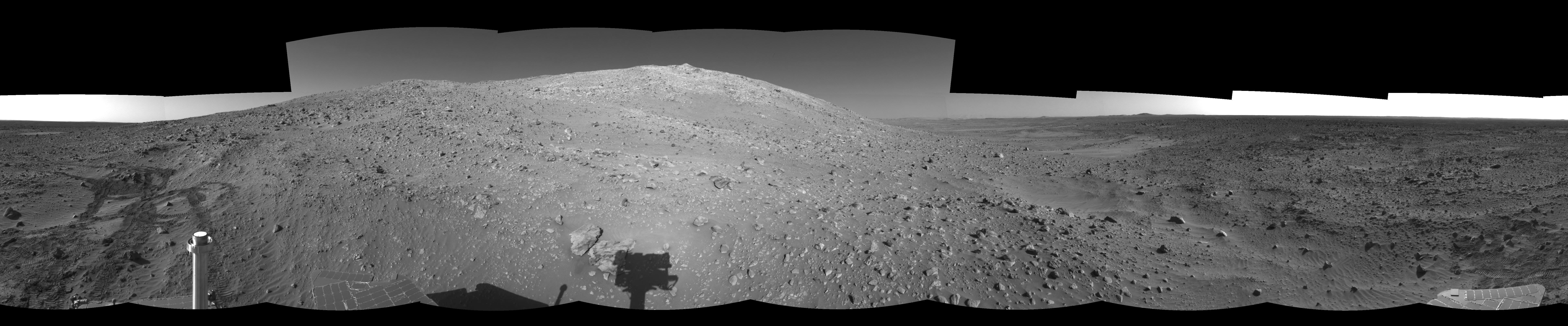 NASA's Mars Exploration Rover Spirit took this right eye of a pair of stereo images, projected at a cylindrical perspective, with its navigation camera on sol 156 (June 11, 2004). The image highlights Spirit's arrival at the base of the Columbia Hills. Since landing at Gusev crater, Spirit has put more than 3.4 kilometers (2.1 miles) on its odometer. Much of this can be attributed to the long drives the rover had to undertake to reach these interesting landforms.