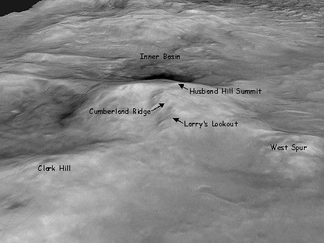This perspective view of a three-dimensional terrain model shows the shape of the "Columbia Hills" landscape where NASA's Mars Exploration Rover Spirit has been working since mid-2004. North is toward the lower left. "Husband Hill" is at the center, with the "Inner Basin" behind it. This view is from images taken by the Mars Orbiter Camera on NASA's Mars Global Surveyor and processed into a three-dimensional terrain model by the U.S. Geological Survey.
