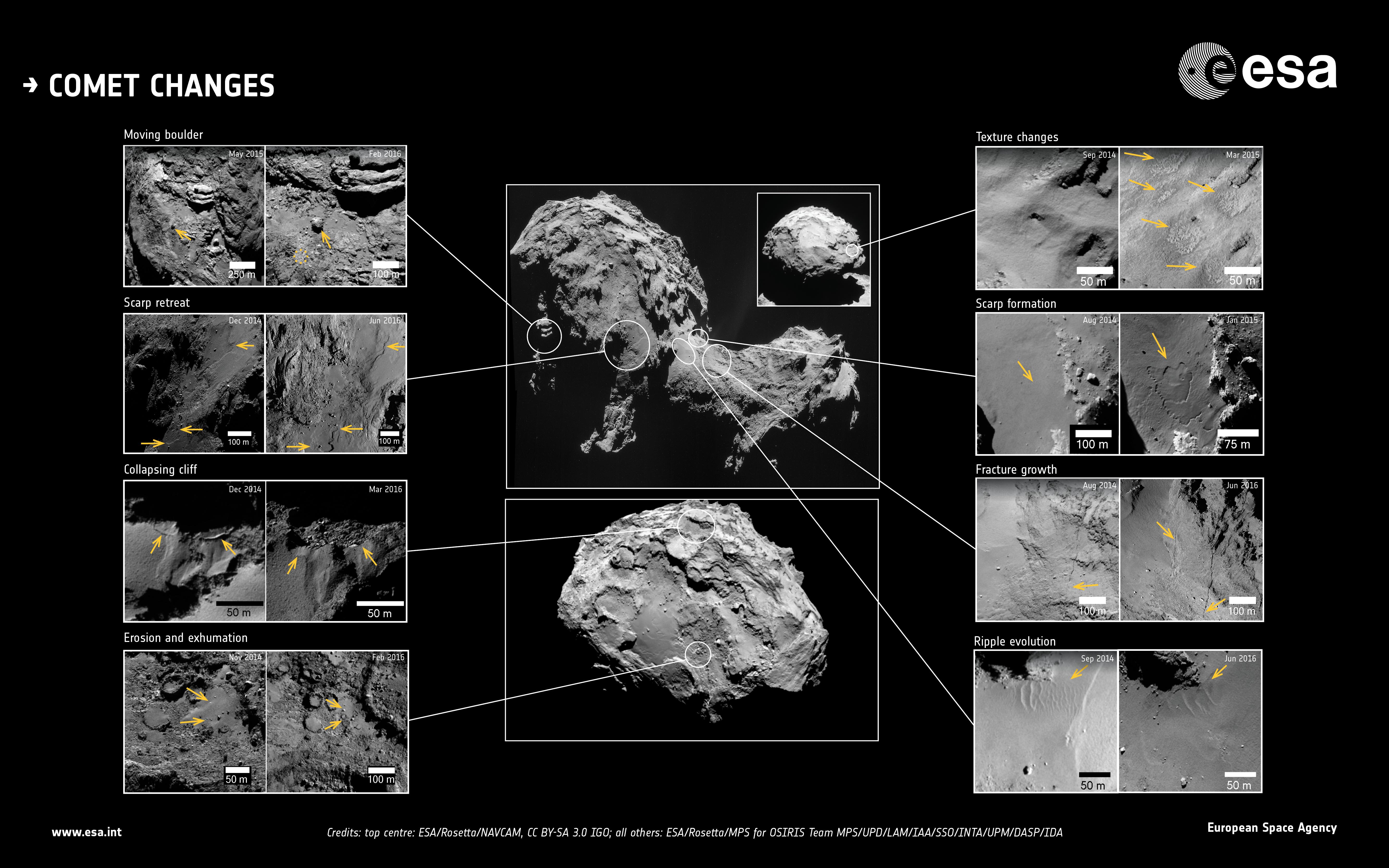 This image showcases changes identified in high-resolution images of Comet 67P/Churyumov-Gerasimenko during more than two years of monitoring by ESA's Rosetta spacecraft.