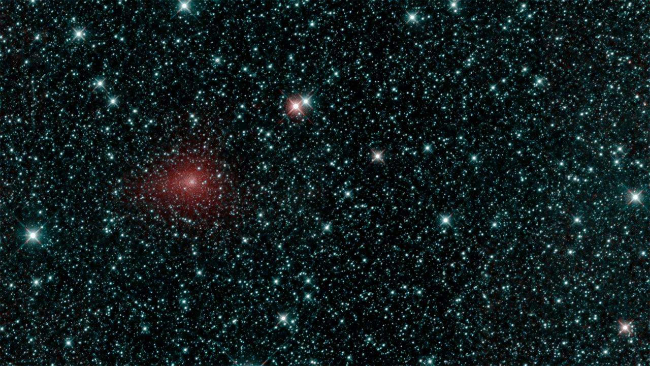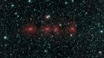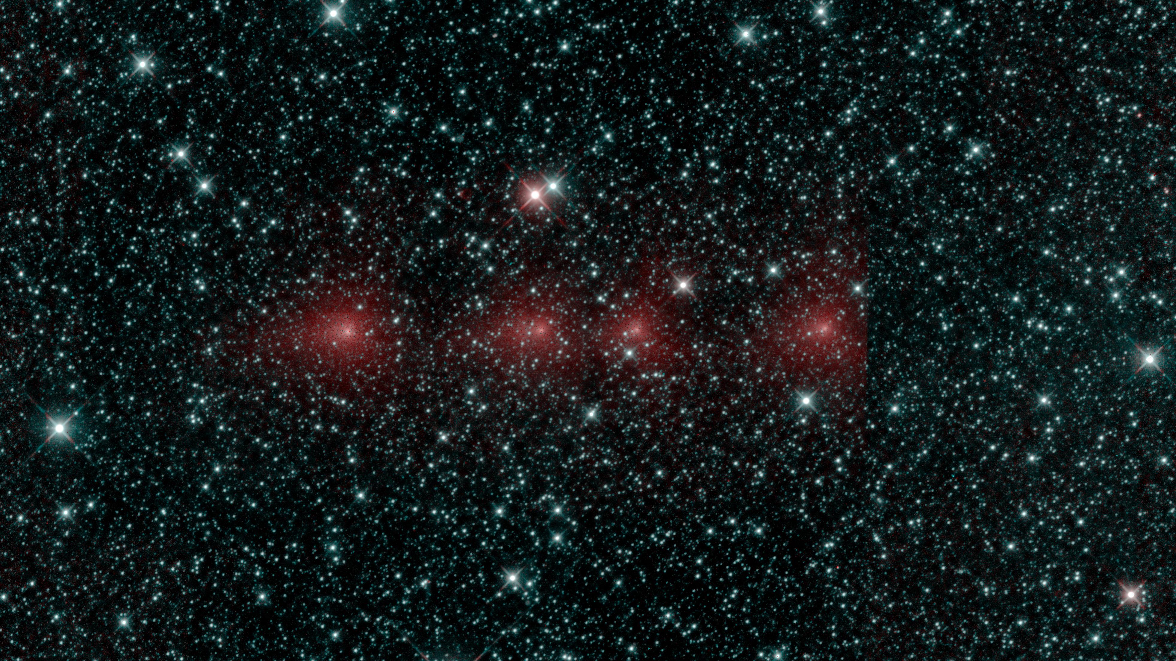 Appearing as a string of red dots, this comet can be seen in a series of exposures captured by the spacecraft. Infrared light detected by the 3.4-micron channel is mapped to blue and green, while light from the 4.6-micron channel is mapped to red. In this image, stars show up as blue because they are hotter, whereas the cooler dust around the comet - with a temperature near the freezing point of water - glows red.