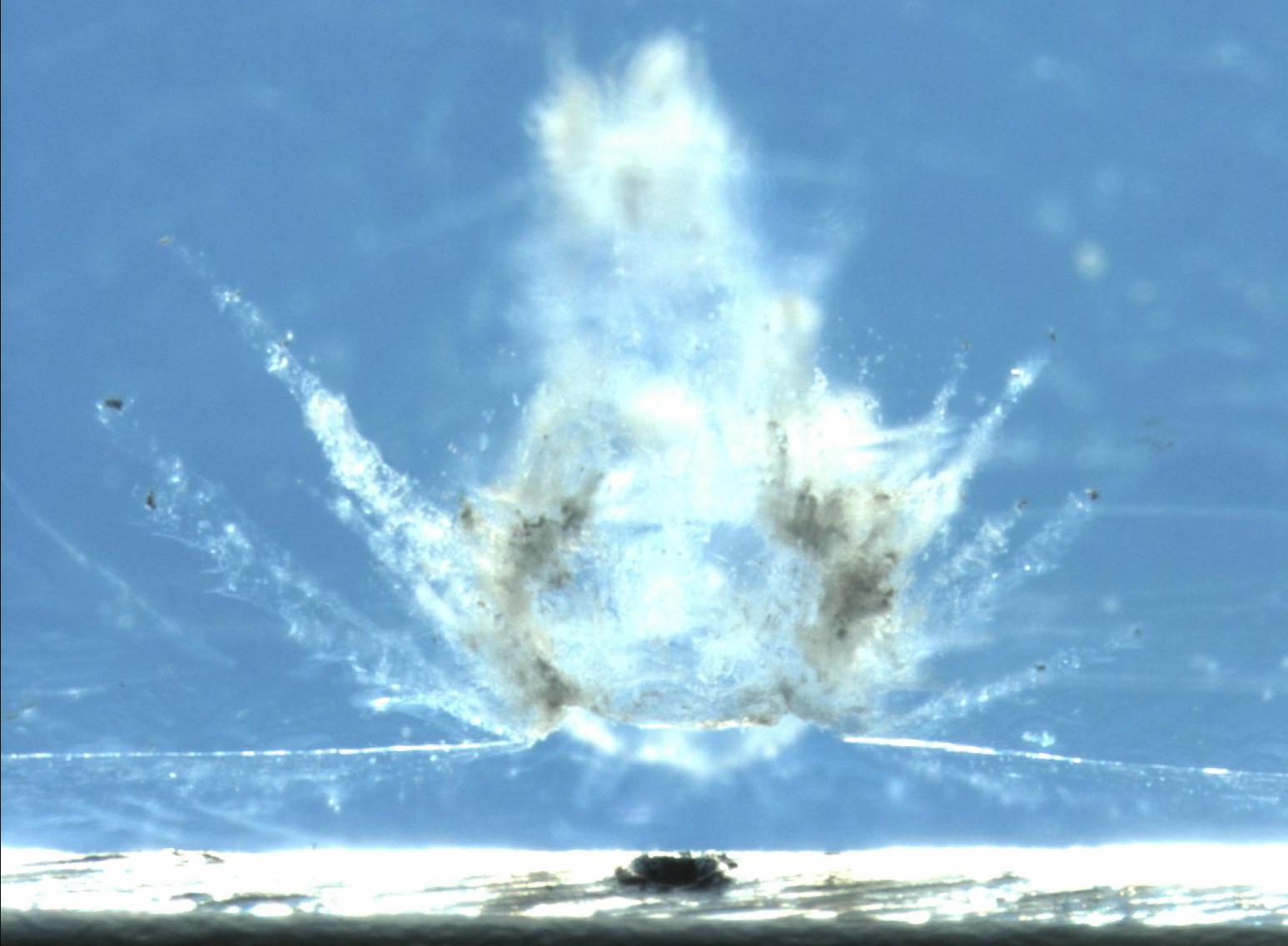 This image shows a particle impact on the aluminum frame that holds the aerogel tiles. The debris from the impact shot into the adjacent aerogel tile producing the explosion pattern of ejecta framents captured in the material. A nice cratering experiment.