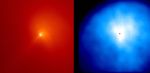 The inner white region of the blue image appears to show that the hydrogen atoms like the dust might be preferentially ejected toward the sunward or day side of the nucleus. However, this is not true. The asymmetric ultraviolet radiation pattern is produced by a roughly spherical distribution of hydrogen atoms because they are so efficient at scattering the incoming solar ultraviolet light. The atoms on the sunward side actually shadow the atoms on the tailward or night side of the coma. The same detailed model analysis of the coma which explains the expansion of the hydrogen atoms in the coma also explains the appearance of the image.