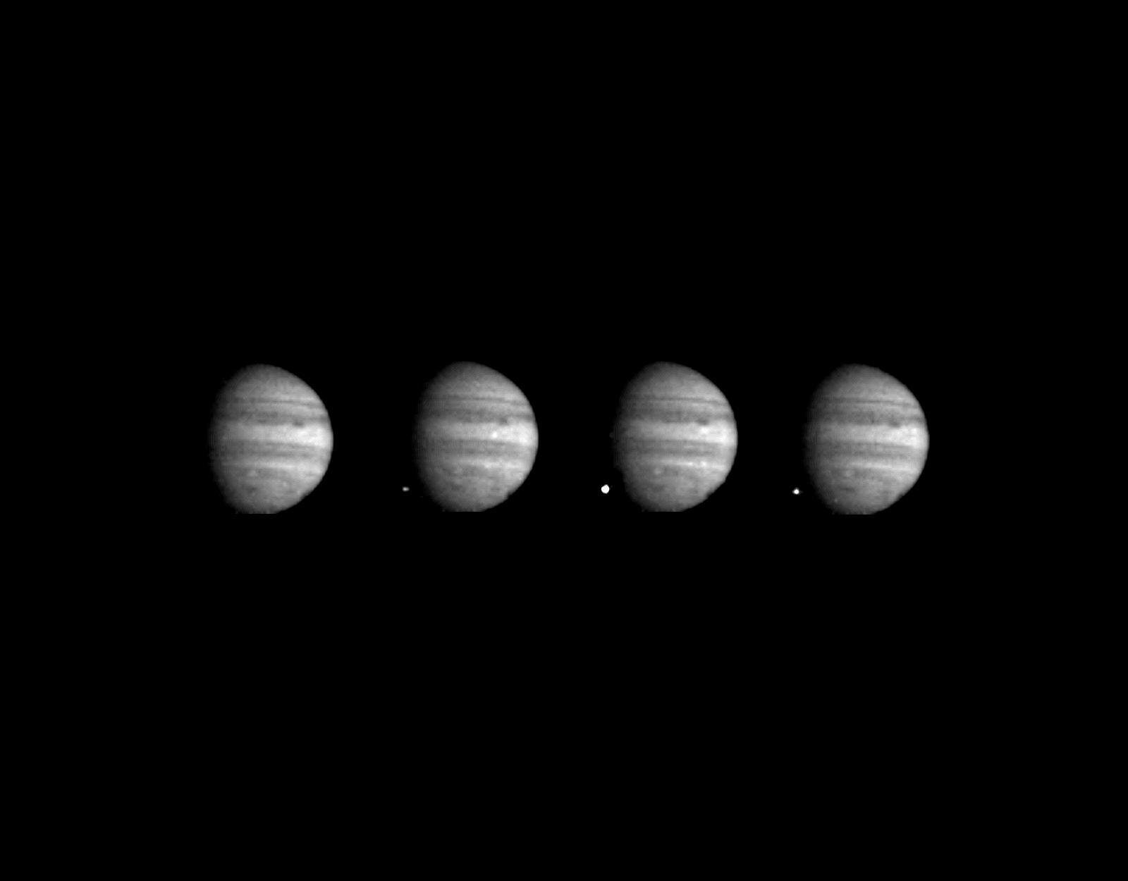 These four images of Jupiter and the luminous night-side impact of fragment W of Comet Shoemaker-Levy 9 were taken by the Galileo spacecraft on July 22, 1994. The spacecraft was 238 million kilometers (148 million miles) from Jupiter at the time, and 621 million kilometers from Earth. The spacecraft was about 40 degrees from Earth's line of sight to Jupiter, permitting this direct view. The images were taken at intervals of 2 1/3 seconds, using the green filter (visible light). The first image, taken at an equivalent time to 8:06:10 Greenwich Mean Time (1:06 a m. Pacific Daylight Time), shows no impact. In the next three images, a point of light appears, brightens so much as to saturate its picture element, and then fades again, seven seconds after the first picture. The location is approximately 44 degrees south as predicted, dark spots to the right are from previous impacts. Jupiter is approximately 60 picture elements in diameter. Galileo tape-recorded most of its observations of the Shoemaker-Levy events during the second week of July 1994 and has since been playing the tape back selectively. Many more pictures and data from other instruments remain to be returned from the spacecraft's tape recorder. Playbacks will continue through January 1995. It is not yet certain whether the data relate to meteor bolides (the comet fragment entering Jupiter's atmosphere) or to the subsequent explosion and fireball. Once all the Galileo, Hubble Space Telescope and groundbased data are integrated, an excellent start-to-finish characterization of these remarkable phenomena will be available. The Galileo project, whose primary mission is the exploration of the Jupiter system in 1995 through 1997, is managed by the Jet Propulsion Laboratory for NASA's Office of Space Science.