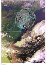To put the size of Mercury's Rembrandt basin into a familiar context, a NAC mosaic of the basin is overlaid on an AVHRR image of the east coast of the United States (see PIA12049). With a diameter of 715 kilometers (444 miles), such a feature if formed at this location on Earth would encompass the cities of Washington, D.C., and Boston, Massachusetts, and everything in between. This graphic was presented last week during a NASA media teleconference Click here to see other items shown during that event.