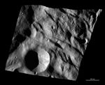 This Dawn FC (framing camera) image shows the texture of the surface in a part of Vesta's southern hemisphere. This region is just north of the main Rheasilvia structure. This image is dominated by the hummocky (i.e., wavy or undulating) terrain of Vesta's southern hemisphere, which is seen here as sets of large, arcuate (i.e., curved) ridges and depressions. These ridges and depressions run nearly horizontally across the image. There is another set of small grooves that run diagonally across this image. They seem to be cutting into, and are therefore younger than, the ridges and depressions. These grooves appear to form complex networks and are less than 500 meters (1,600 feet) wide on average. There is also a large crater in the bottom of this image, which has a sharp, fresh rim and slumping features along its rim and sides. However, this image does not contain many craters, which is not unexpected as it is located in Vesta's less heavily cratered southern hemisphere.