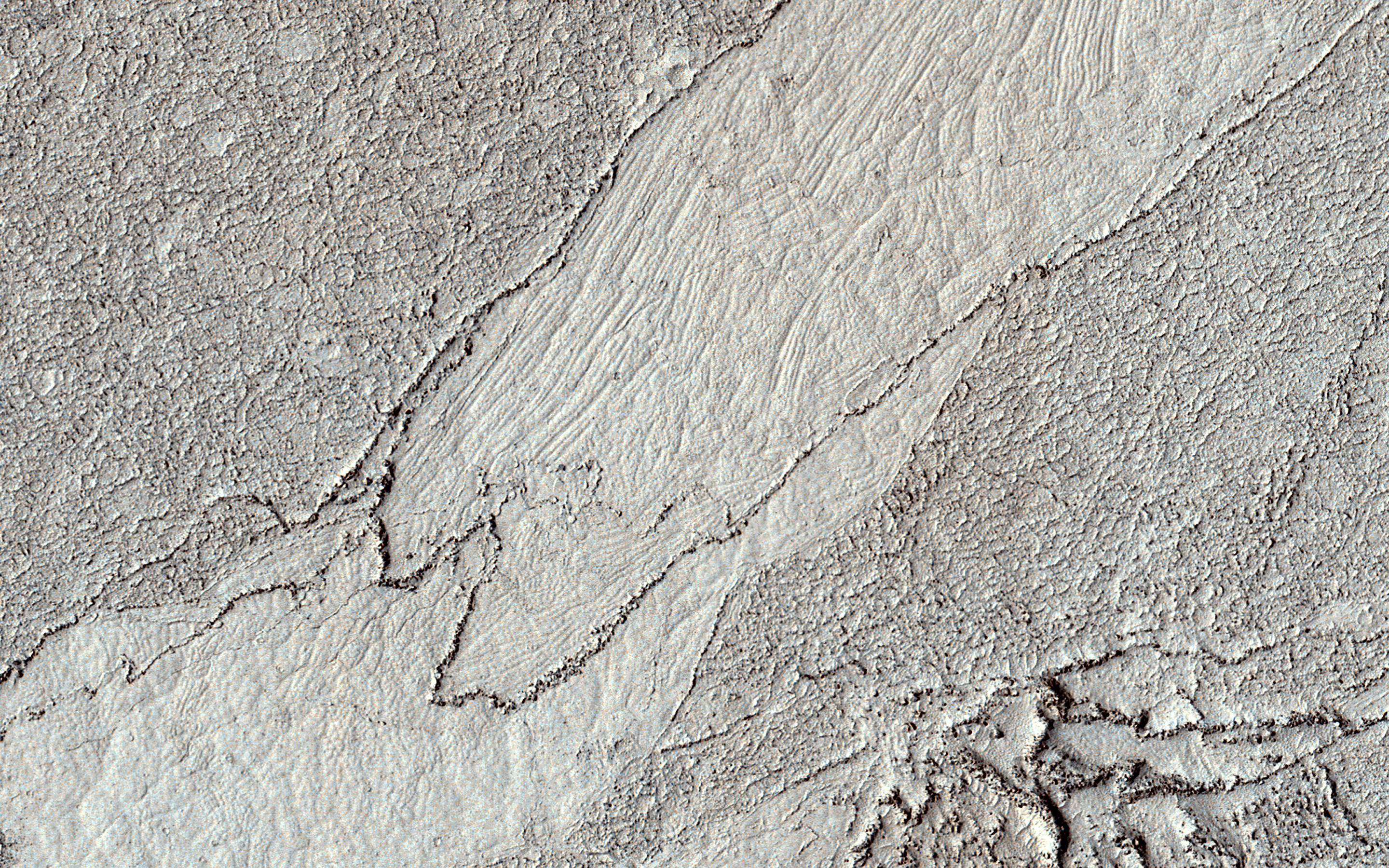 This HiRISE image shows a classic example of platy-ridged lava. Scientists think that this is the same as a lava type called "rubbly pahoehoe" on Earth.