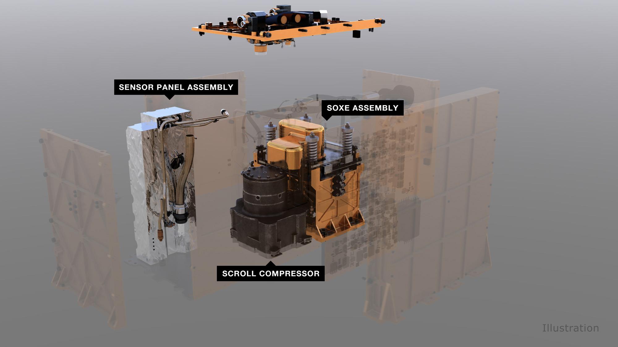 An illustration of MOXIE (Mars Oxygen ISRU Experiment) and its components. An air pump pulls in carbon dioxide gas from the Martian atmosphere, which is then regulated and fed to the Solid OXide Electrolyzer (SOXE), where it is electrochemically split to produce pure oxygen.