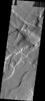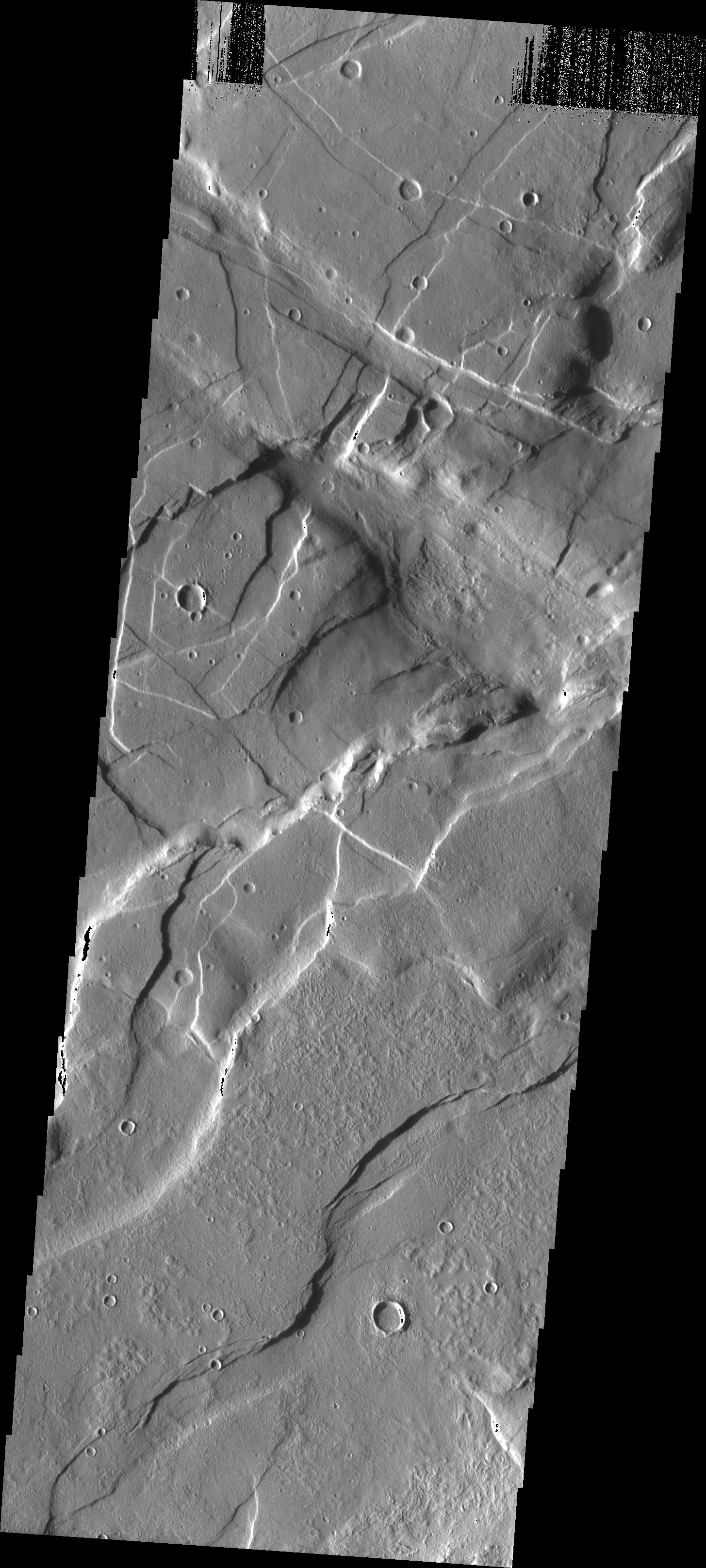 This VIS image taken in the region east of Alba Patera shows the complex relations that can occur in regions of multiple structural events. There are fractures and graben in this area that intersect at multiple angles.