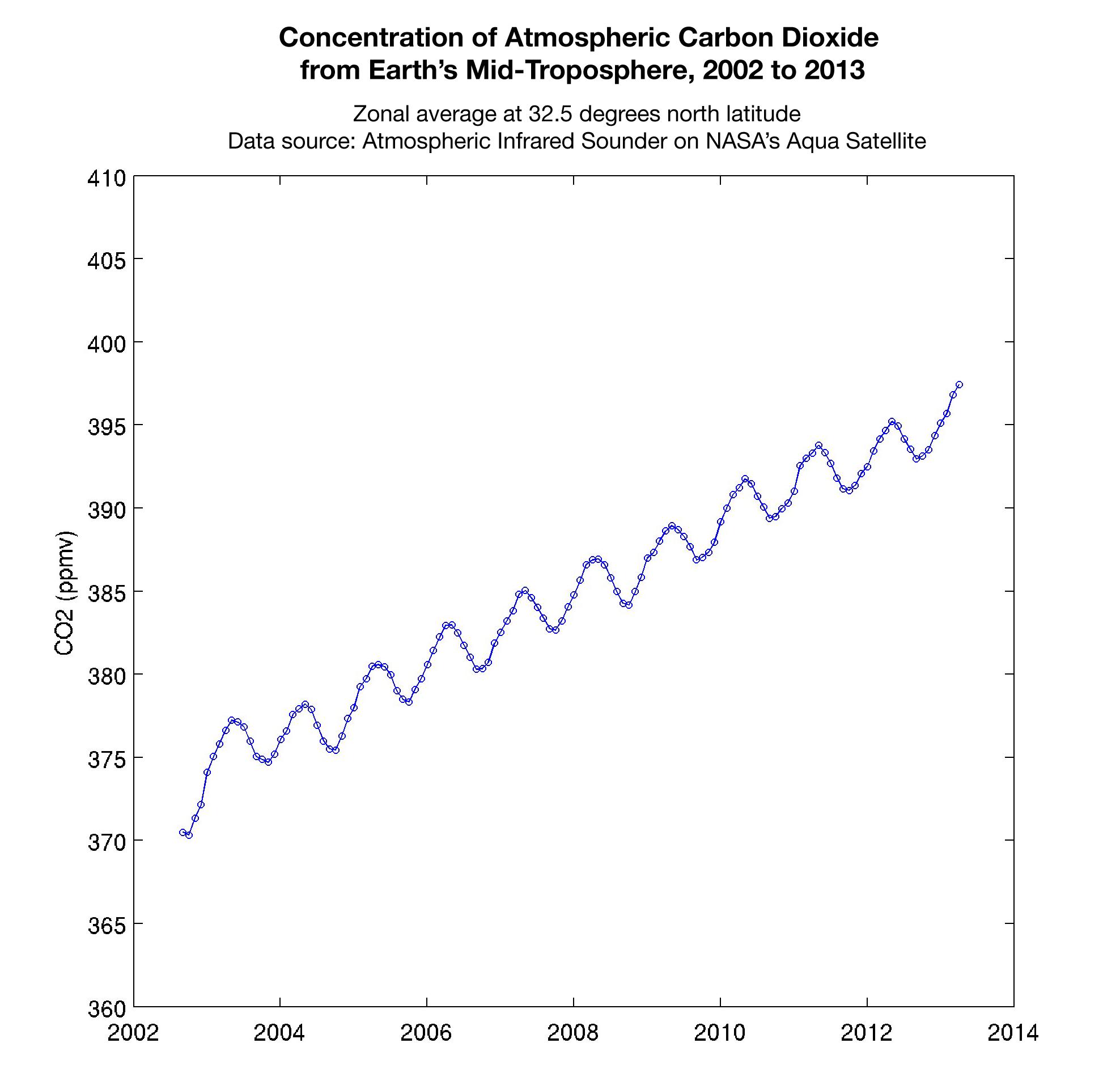 The sawtooth pattern reflects plants "breathing in" carbon dioxide as they grow, removing this gas from the atmosphere. Soil and plants then release carbon dioxide back into the atmosphere when plants die at the end of the growing season. The upward slope of the graph shows the continuous increase in the concentration of carbon dioxide in Earth's atmosphere. In 2002 the AIRS instrument--which collects data around the entire globe every day -- reported the average concentration of carbon dioxide in Earth's mid-troposphere to be 372 parts per million (ppm). In 2013, AIRS reported April's average daily global concentration in this region to be 397 ppm.