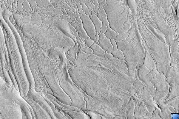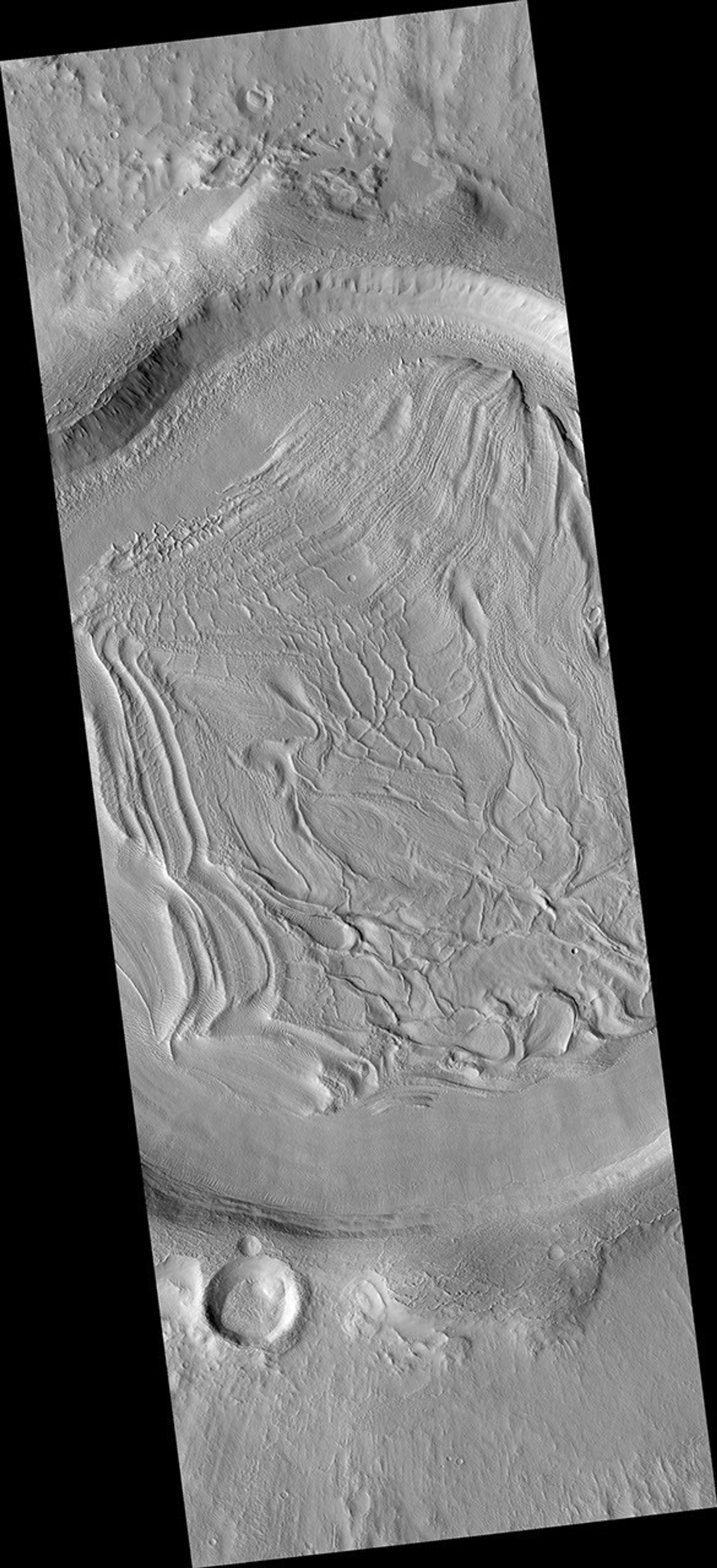 The intriguing landforms in the floor of this crater are known as "concentric crater fill." Such landforms are found at high latitudes (approximately above 30° from the equator), where theoretical calculations indicate that ice may exist under the surface, mixed with rocks and soil. Examples of concentric crater fill were first observed in the 1970s, in images acquired by cameras on board the Viking orbiters.
