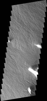 Note: this THEMIS visual image has not been radiometrically nor geometrically calibrated for this preliminary release. An empirical correction has been performed to remove instrumental effects. A linear shift has been applied in the cross-track and down-track direction to approximate spacecraft and planetary motion. Fully calibrated and geometrically projected images will be released through the Planetary Data System in accordance with Project policies at a later time.