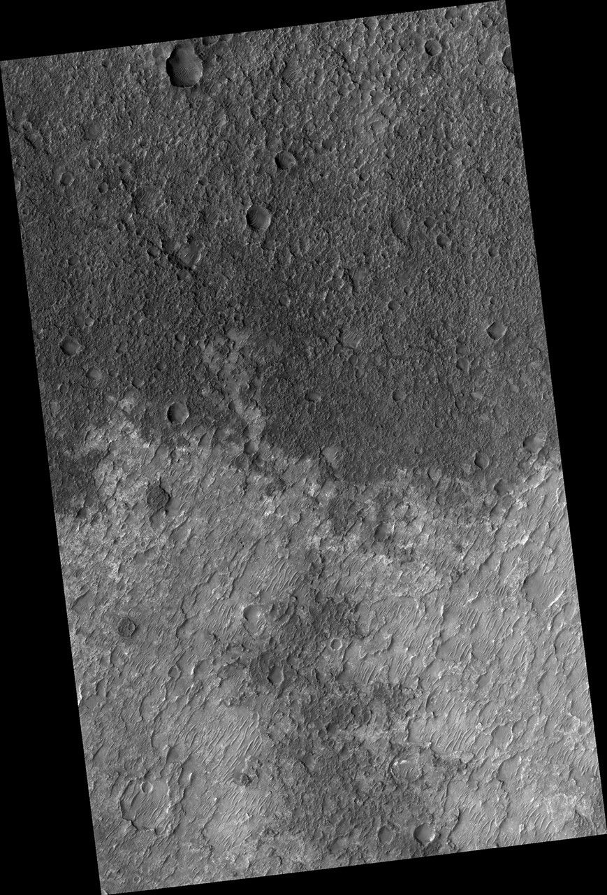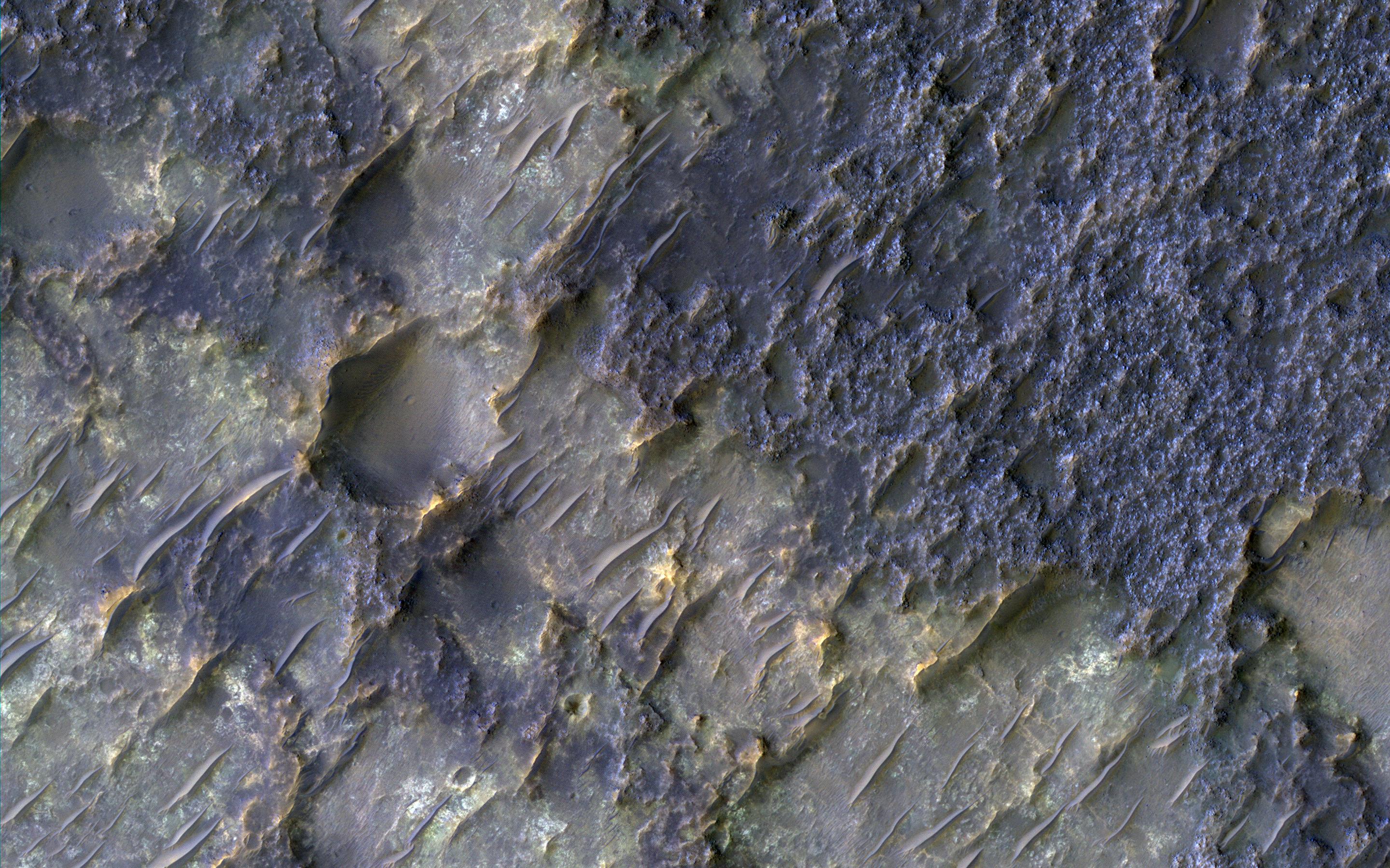 The overlying, rougher blueish-toned bedrock appears to have undergone the most extensive erosion, revealing the smoother, fractured yellowish-toned bedrock below. We see windblown (aeolian) bedforms across the image, possibly the culprit behind the erosive forces that have removed and uncovered the underlying yellowish-toned bedrock visible today.