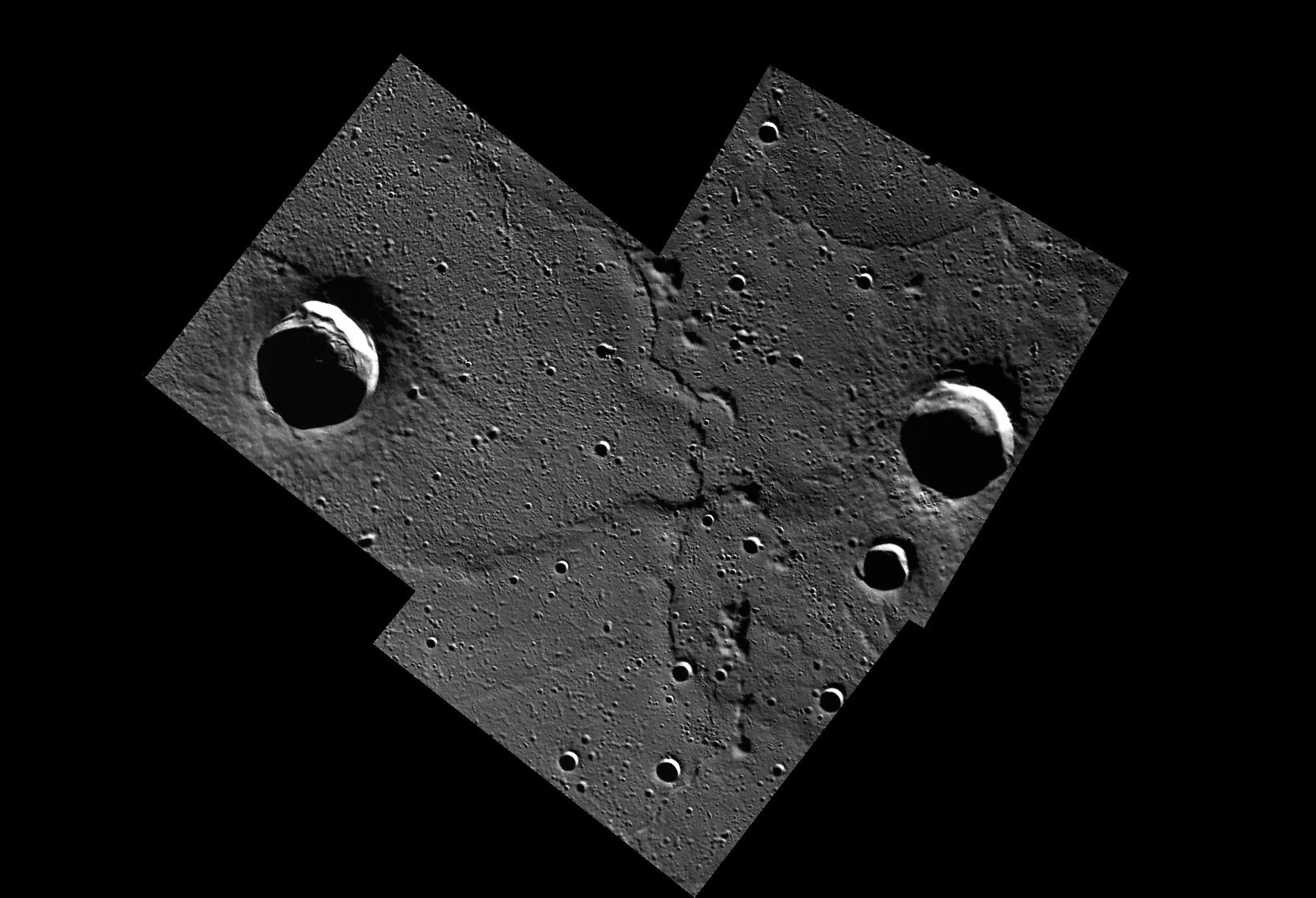 Scale: The two largest impact craters are about 25 km (15 mi.) in diameter.