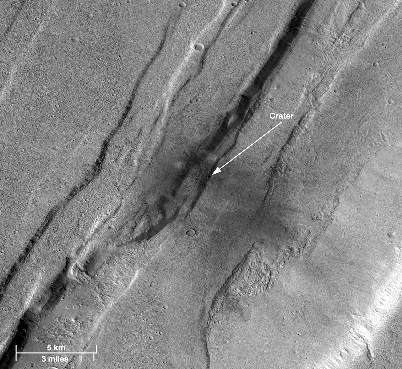 The meteoroid struck the side of a graben – a depression created by faults. The impact crater left behind is roughly 427 feet (130 meters) across.