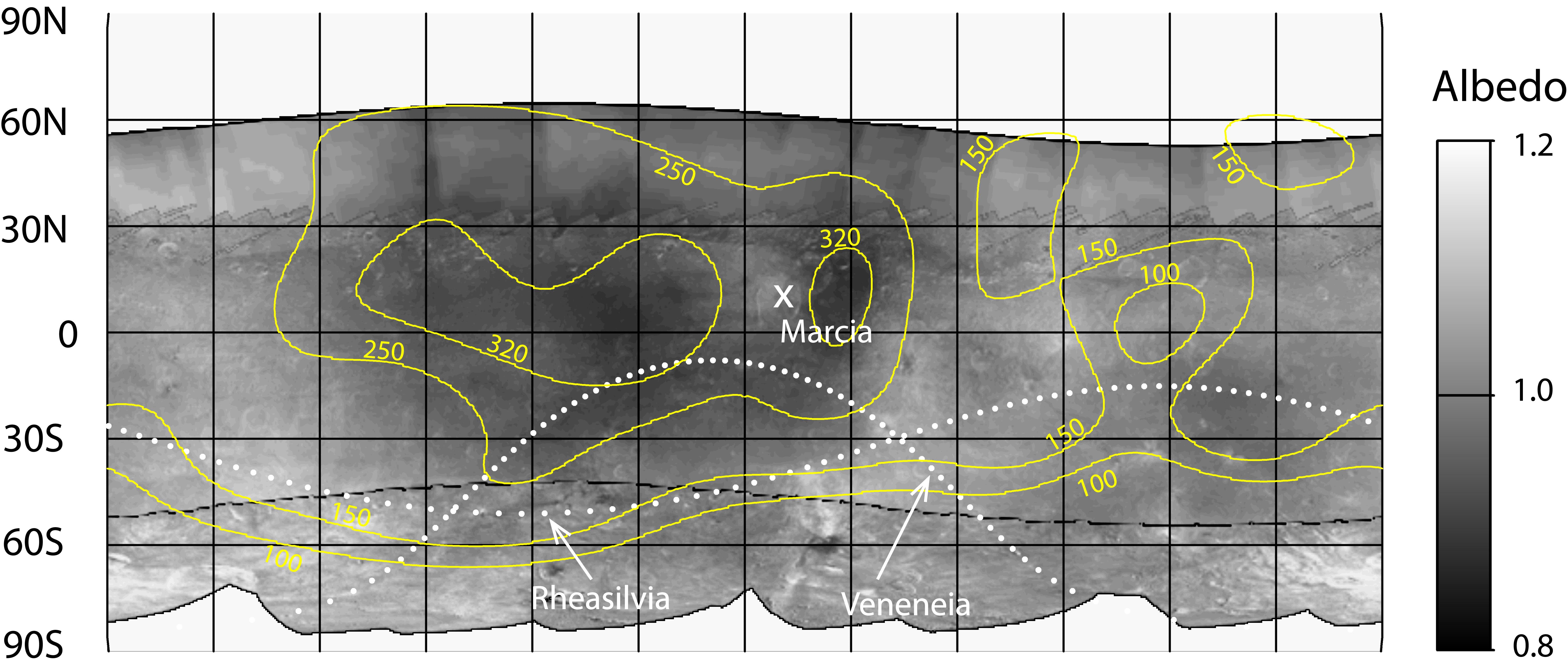 Hydrogen is most abundant in areas with low reflectivity, or albedo, on the giant asteroid Vesta, as shown in this contour map from NASA's Dawn mission. The hydrogen detected by Dawn's gamma ray and neutron detector instrument likely exists in the form of hydrated minerals delivered by carbon-rich space rocks that darkened Vesta's surface.