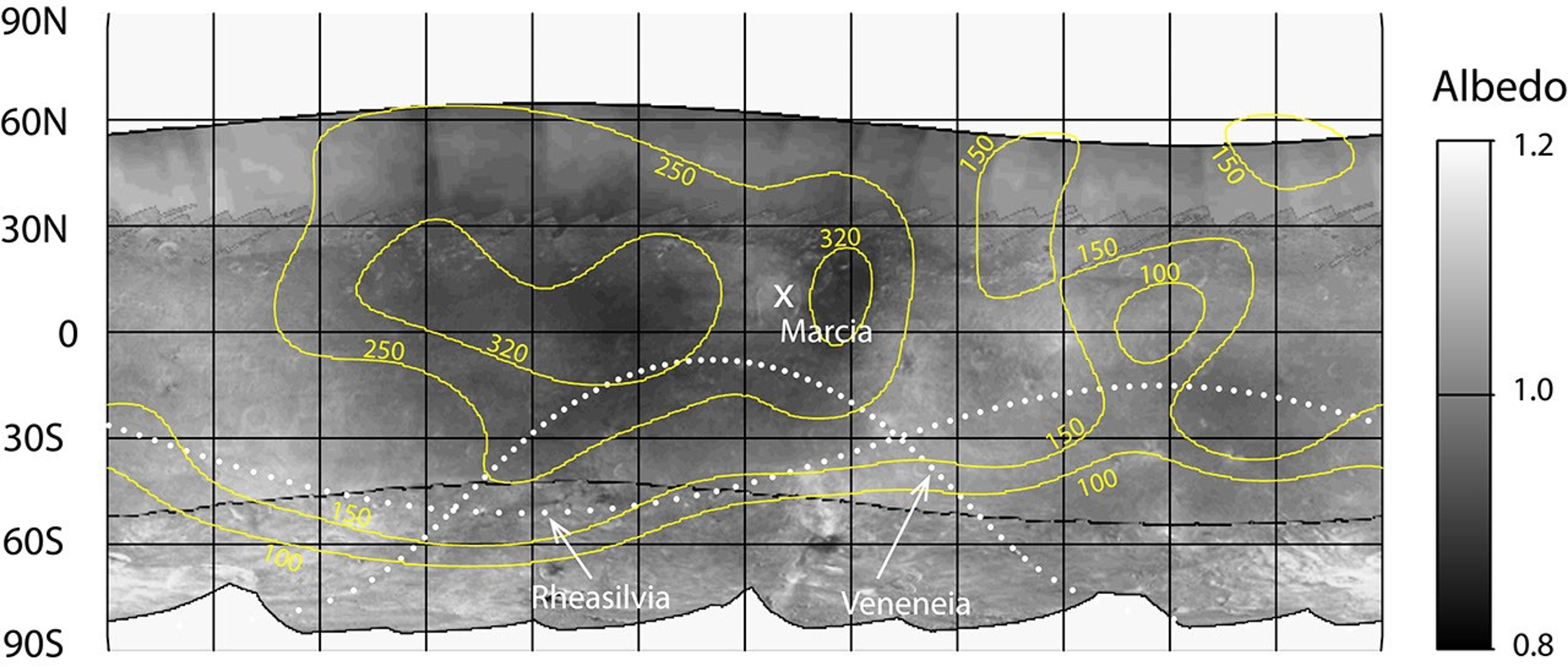 The range of mapped albedo values is indicated by the scale bar. Contours of hydrogen abundance are superimposed on the map in yellow. Hydrogen abundances have units of micrograms of hydrogen per gram of surface material.