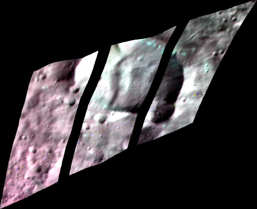 In this contrast-enhanced infrared image of Bellicia Crater on the giant asteroid Vesta, scientists from NASA's Dawn mission can see signs of the mineral olivine. Olivine was not expected to be found at Bellicia. Olivine is found on the crater walls, floor and ejecta.