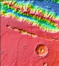 A landslide deposit is visible in this VIS image of Coprates Catena. Coprates Catena parallels the much larger Coprates Chasma; both are part of Valles Marineris.