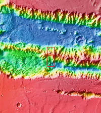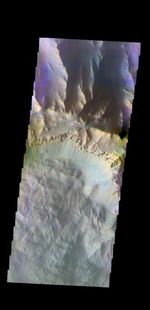 The THEMIS VIS camera contains 5 filters. The data from different filters can be combined in multiple ways to create a false color image. These false color images may reveal subtle variations of the surface not easily identified in a single band image. Today's false color image shows part of Coprates Chasma.