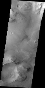 Note: this THEMIS visual image has not been radiometrically nor geometrically calibrated for this preliminary release. An empirical correction has been performed to remove instrumental effects. A linear shift has been applied in the cross-track and down-track direction to approximate spacecraft and planetary motion. Fully calibrated and geometrically projected images will be released through the Planetary Data System in accordance with Project policies at a later time.