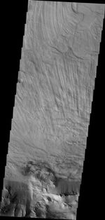 The finely ridged material in this VIS image are huge landslide deposits called Coprates Labes. These landslide deposits are located on the floor of Coprates Chasma.