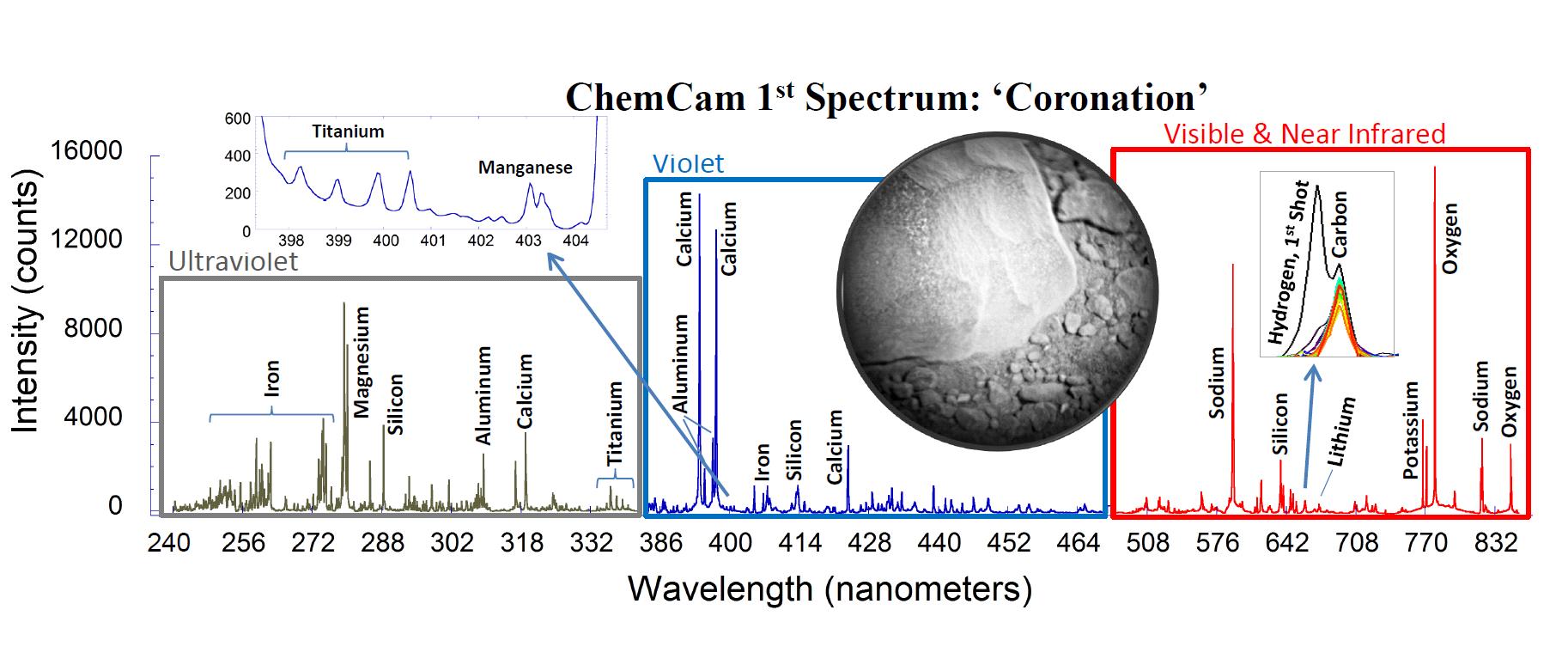 This is the first laser spectrum from the Chemistry and Camera (ChemCam) instrument on NASA's Curiosity rover, sent back from Mars on August 19, 2012. The plot shows emission lines from different elements present in the target, a rock near the rover's landing site dubbed "Coronation" (see inset).