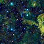 Color in this image represents specific wavelengths of infrared light. Blue and cyan represent light emitted at 3.4 and 4.6 microns, primarily from hot stars. Green and red represent light emitted at 12 and 22 microns, primarily from clouds of dust.