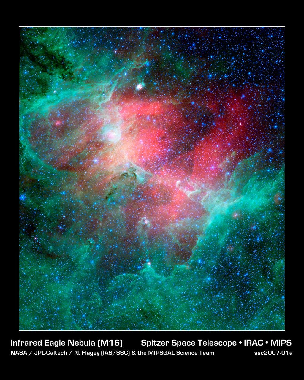 This majestic view taken by NASA's Spitzer Space Telescope tells an untold story of life and death in the Eagle nebula, an industrious star-making factory located 7,000 light-years away in the Serpens constellation. The image shows the region's entire network of turbulent clouds and newborn stars in infrared light.