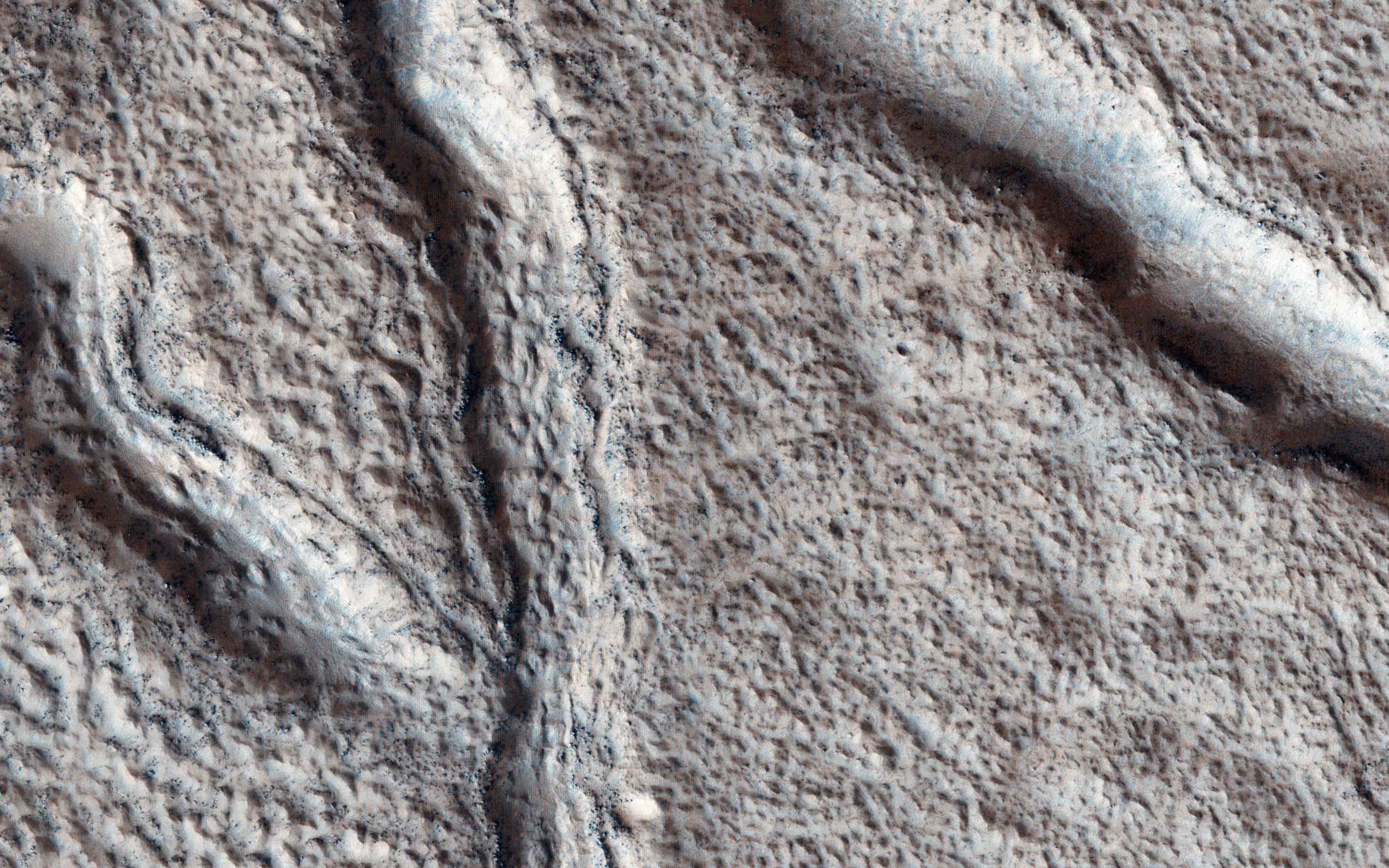 The apron could be (or could have been) ice-rich, so one possibility is that the fissures are related to ice loss. Based on radar data from MRO combined with studies of the region's geology from other orbiters, scientists think that extensive glaciers covered this region several hundred million years ago.