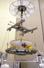 In the Payload Hazardous Servicing Facility, an overhead crane lowers the Mars Exploration Rover (MER) aeroshell toward a rotation stand. Set to launch in 2003, the MER Mission will consist of two identical rovers designed to cover roughly 110 yards (100 meters) each Martian day. Each rover will carry five scientific instruments that will allow it to search for evidence of liquid water that may have been present in the planet's past. The rovers will be identical to each other, but will land at different regions of Mars. The first rover has a launch window opening May 30, and the second rover a window opening June 25, 2003.