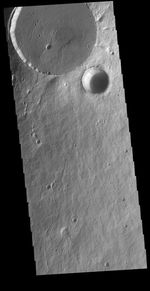 This VIS image shows two circular features. The flat floored feature at the top of the image is the summit caldera of Elysium Mons and was formed by volcanic activity. The bowl-shaped feature next to the caldera is an impact crater.