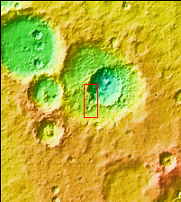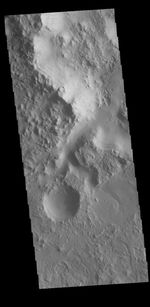 Today's VIS image has a channel dissecting a crater rim, flowing from the interior of a large crater into a smaller crater on the large crater's floor. The two craters are unnamed and located in northern Terra Sabaea.