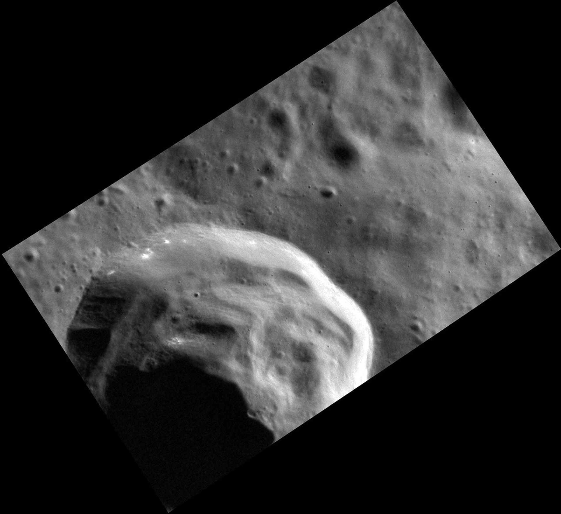 The crater in this stunning image has prominent slump deposits that were created as the crater and ejecta collapsed back in on itself immediately after crater formation. If you look closely, you can also see that the rim appears to host small patches of hollows. One clue to understanding hollow formation is that they appear to form preferentially on sunward facing slopes (because this crater is at a high northern latitude, its northern wall gets the most exposure to the Sun). This extra heating may enhance the loss of volatiles PIA14853 from the surface.