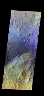 The THEMIS VIS camera contains 5 filters. The data from different filters can be combined in multiple ways to create a false color image. These false color images may reveal subtle variations of the surface not easily identified in a single band image. Today's false color image shows dunes on the floor of an unnamed crater in Terra Sabaea.