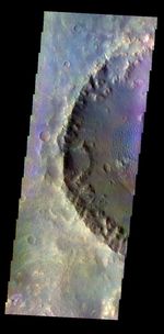 The THEMIS VIS camera contains 5 filters. The data from different filters can be combined in multiple ways to create a false color image. These false color images may reveal subtle variations of the surface not easily identified in a single band image. Today's false color image shows an unnamed crater on the floor of the much larger Molesworth Carter. Dunes on the floor of the crater are blueish, and surface sands are typically this color in false color images.