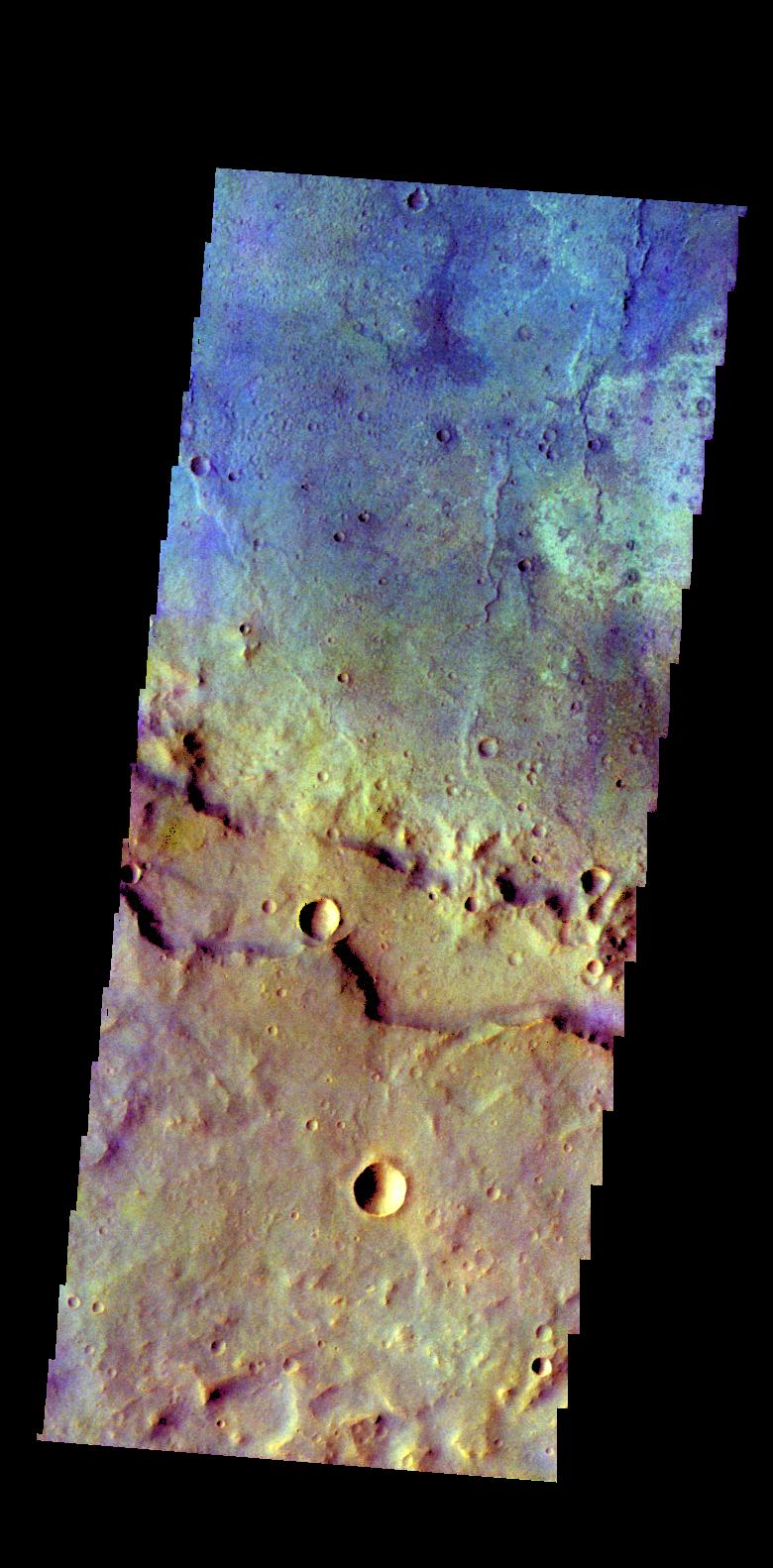 The THEMIS VIS camera contains 5 filters. The data from different filters can be combined in multiple ways to create a false color image. These false color images may reveal subtle variations of the surface not easily identified in a single band image. Today's false color image shows part of an unnamed crater in Terra Sirenum.