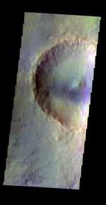 The THEMIS VIS camera contains 5 filters. The data from different filters can be combined in multiple ways to create a false color image. These false color images may reveal subtle variations of the surface not easily identified in a single band image. Today's false color image shows an unnamed crater in Acidalia Planitia.