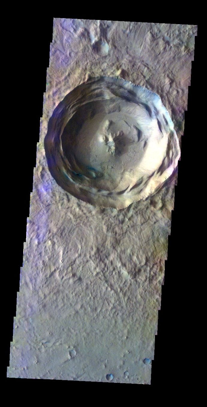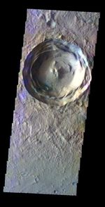 The THEMIS VIS camera contains 5 filters. The data from different filters can be combined in multiple ways to create a false color image. These false color images may reveal subtle variations of the surface not easily identified in a single band image. Today's false color image shows an unnamed crater in Isidis Planitia.