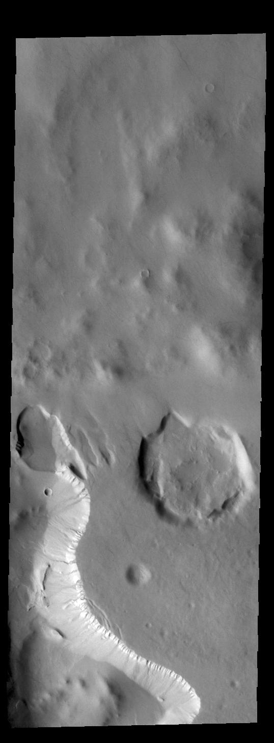 Today's VIS image shows part of an unnamed crater in Noachis Terra. Several craters in the southern hemisphere contain floor fill that has subsequently been eroded to form depressions in the fill material. Many depressions of this type are parallel to the crater wall. Other depressions are located in the center of the crater and are relatively linear. This crater depression is of the second type. Several gullies are visible on the side of the depression at the bottom of the image.