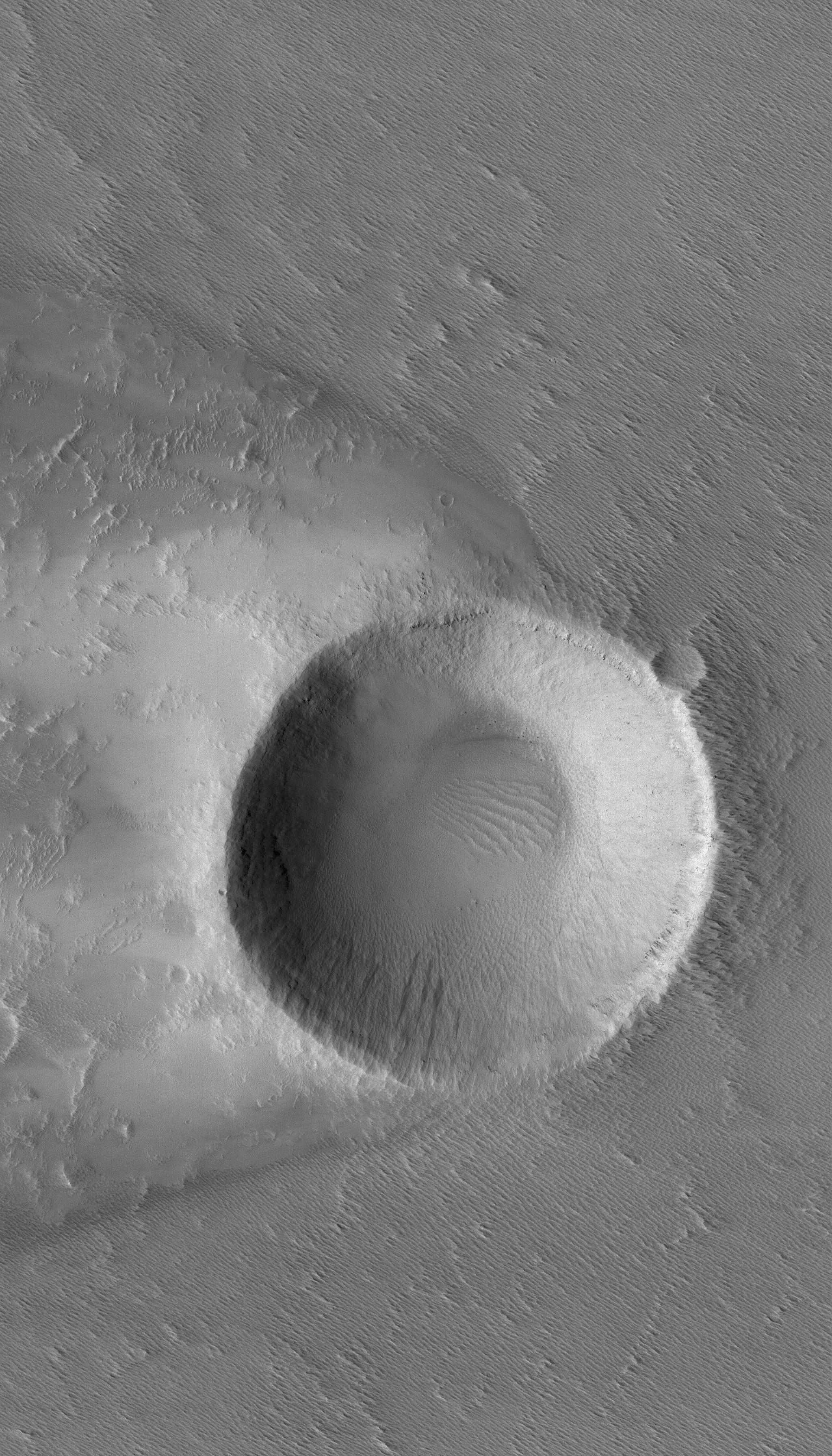 This Mars Global Surveyor (MGS) Mars Orbiter Camera (MOC) image shows an impact crater in western Daedalia Planum, around which has developed a wind streak that runs off to the west (left) of the image. The winds responsible for the streak came from the east (right).