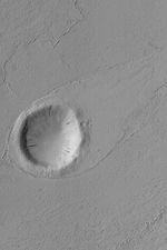 This Mars Global Surveyor (MGS) Mars Orbiter Camera (MOC) image shows a streamlined tail-pointing toward the upper right (northeast)--in the lee of a meteor impact crater in Marte Vallis, a large valley and channel complex southeast and east of the Elysium volcanic region. The fluid that went through Marte Vallis, whether water, mud, lava, or otherwise, created this form as it moved from the lower left (southwest) toward the upper right. The crater is located near 19.0°N, 174.9°W. The image covers an area 3 km (1.9 mi) wide and is illuminated from the left.