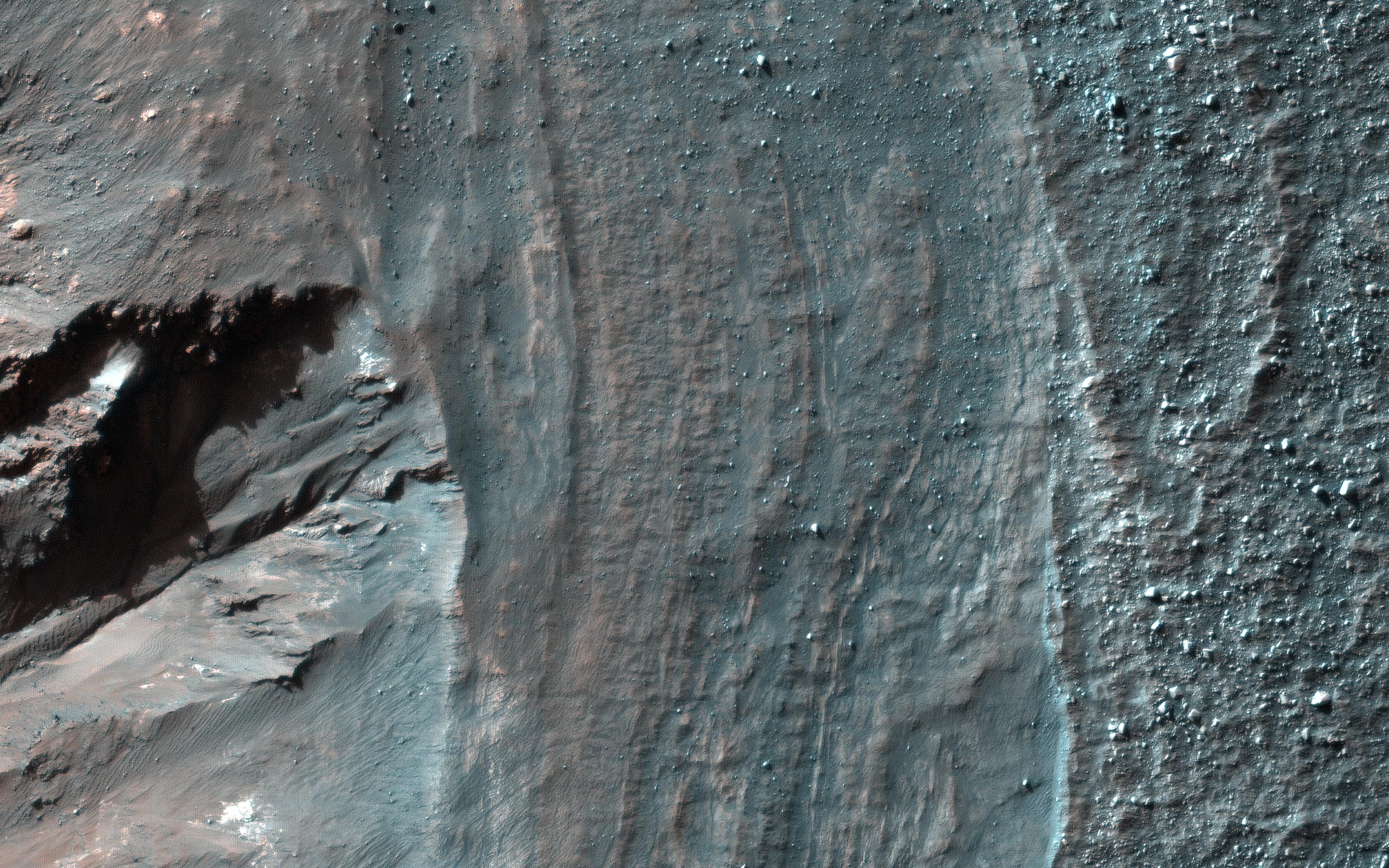 This observation from NASA's Mars Reconnaissance Orbiter shows a close view of the rim and upper wall of an impact crater on the Martian surface. The layers in enhanced color are exposed subsurface strata that are relatively resistant to erosion. Boulder-like rubble beyond the crater rim is scattered down the wall of the crater (down-slope is toward the lower left of the image).