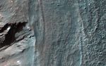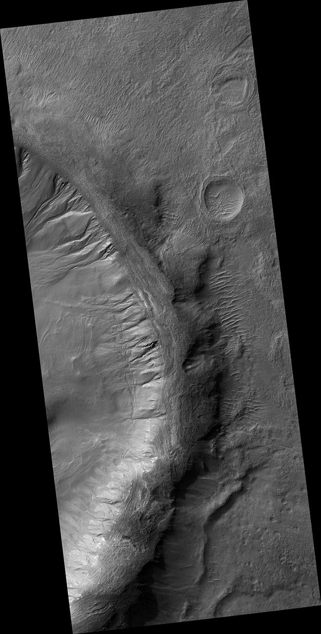 Another feature of interest to Mars scientists is a large gully roughly 100 meters across. These gullies may have formed when water from melted ice on the crater walls, or from groundwater within the walls, assisted in transporting eroding material downslope.