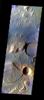 This false color image shows a region with craters of different ages located at the margin of Acidalia Planitia. This image was collected during the Northern Spring season.