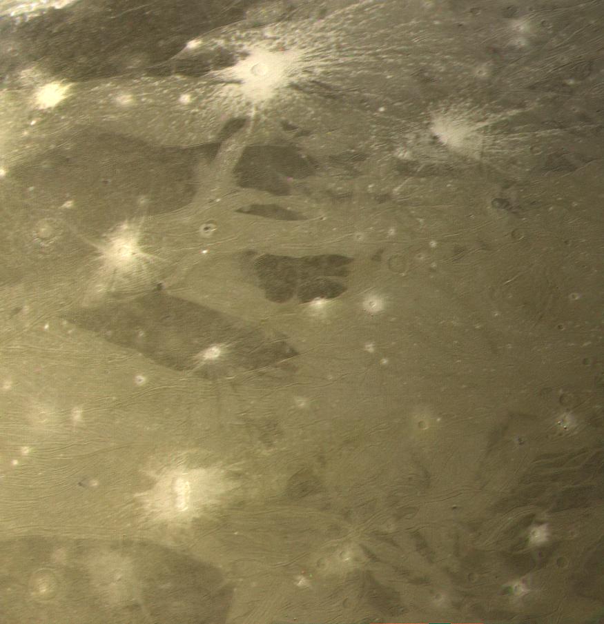 This color picture as acquired by Voyager 1 during its approach to Ganymede on Monday afternoon (the 5th of March). At ranges between about 230 to 250 thousand km. The image shows detail on the surface with a resolution of four and a half km. This picture is just south of PIA01515 (P21161) and shows more craters. It also shows the two distinctive types of terrain found by Voyager, the darker ungrooved regions and the lighter areas which show the grooves or fractures in abundance. The most striking features are the bright ray craters which havE a distinctly "bluer" color appearing white against the redder background. Ganymede's surface is known to contain large amounts of surface ice and it appears that these relatively young craters have spread bright fresh ice materials over the surface. Likewise, the lighter color and reflectivity of the grooved areas suggests that here too, there is cleaner ice. We see ray craters with all sizes of ray patterns, ranging from extensive systems of the crater in the northern part of this picture, which has rays at least 300-500 kilometers long, down to craters which have only faint remnants of bright ejecta patterns. This variation suggests that, as on the Moon, there are processes which act to darken ray material, probably "gardening" by micrometeoroid impact. JPL manages and controls the Voyager project for NASA's Office of Space Science.
