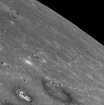 As MESSENGER sped by Mercury on January 14, 2008, the Narrow Angle Camera (NAC) of the Mercury Dual Imaging System (MDIS) captured this image, which includes the edge of the planet against the blackness of space. Much of the foreground shows a portion of Caloris basin, one of the largest impact basins in the solar system. The two large craters near the bottom of this image can be identified on the northwestern floor of the basin on the mosaicked image of Caloris (see PIA10383) released at MESSENGER's NASA press conference on January 30. The large crater in the bottom middle of this image has a diameter of about 70 kilometers (40 miles).