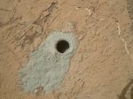 Curiosity used the Mars Hand Lens Imager (MAHLI) camera on the rover's arm to capture this view of the hole in Cumberland on the same sol as the hole was drilled. The diameter of the hole is about 0.6 inch (1.6 centimeters). The depth of the hole is about 2.6 inches (6.6 centimeters).