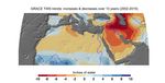 Cumulative total freshwater losses in North Africa and the Middle East from 2002 to 2015 (in inches) observed by NASA's Gravity Recovery and Climate Experiment (GRACE) mission. Total water refers to all of the snow, surface water, soil water and groundwater combined. Groundwater depletion in Turkey, Syria, Iraq and Iran, and along the Arabian Peninsula, are leading to large changes in total water storage in the region. Likewise, drought and groundwater pumping is contributing to the drying of the Caspian Sea Region. The Northwest Sahara Aquifer System, which underlies Tunisia and Libya, is also experiencing increasing water stress as shown in the map. Image updated from Voss et al., 2013.