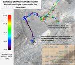 This map, covering an area about 130 feet (40 meters) across, shows results from DAN's multiple traverses over the area, with color coding for levels of hydrogen detected. The red coding indicates amounts of hydrogen three to four times as high as the amounts detected anywhere previously along Curiosity's traverse of about 6.9 miles (11.1 kilometers) since landing in August 2012. The inset map at lower right shows the full traverse through Sol 1051 (July 21, 2015), with names assigned to rectangles within Gale Crater for geological mapping purposes. The vertical bar at left indicates the color coding according to counts per second in DAN's passive mode.