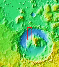 During the month of April Mars will be in conjunction relative to the Earth. This means the Sun is in the line-of-sight between Earth and Mars, and communication between the two planets is almost impossible. For conjunction, the rovers and orbiting spacecraft at Mars continue to operate, but do not send the data to Earth. This recorded data will be sent to Earth when Mars moves away from the sun and the line-of-sight between Earth and Mars is reestablished. During conjunction the THEMIS image of the day will be a visual tour of Gale Crater, the location of the newest rover Curiosity. Our first image of Gale Crater contains the landing site of the rover in approximately the center of the image. The dark material is sand in the form of dunes, which the rover will have to navigate through to get to the layered central deposit. The layered deposit is called Mt. Sharp.
